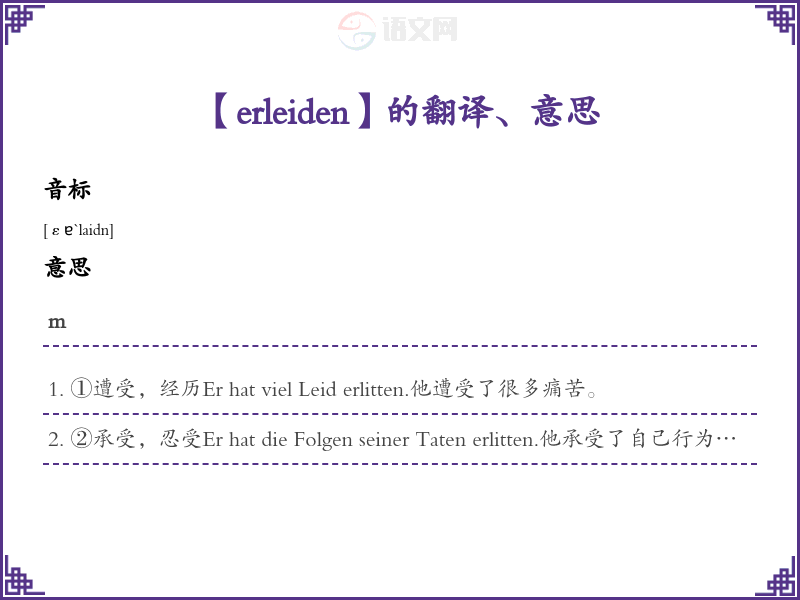 ①遭受,经历Er hat viel Leid erlitten.他遭受了很多痛苦。