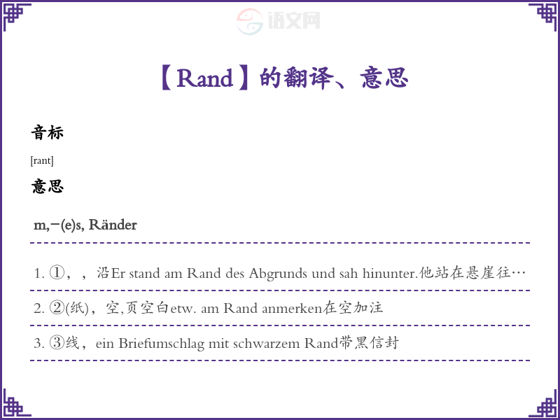 ①,,沿Er stand am Rand des Abgrunds und sah hinunter.他站在悬崖往下看。am Rand +二格 stehen处在…jn an den Rand +二格 bringen使某人濒临…[粗] Halt den Rand![粗]安静点!