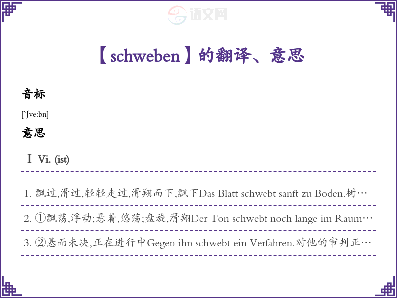 ①飘荡,浮动;悬着,悠荡;盘旋,滑翔Der Ton schwebt noch lange im Raum nach. 这个声音还久久地回荡在房间里。