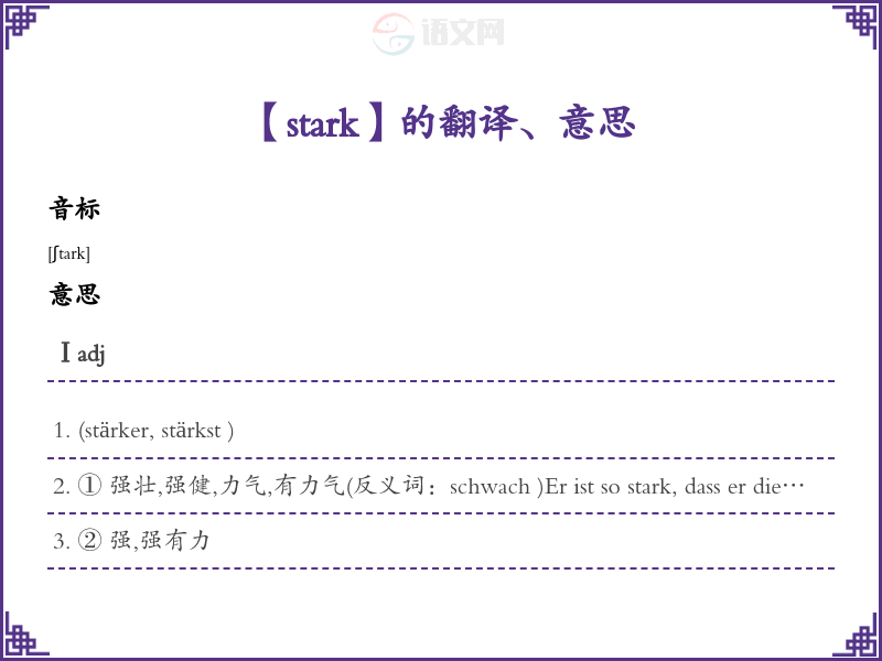① 强壮,强健,力气,有力气(反义词:schwach )Er ist so stark, dass er die schwere Kiste allein tragen kann .他很有力,那么沉重箱子都搬得起来。