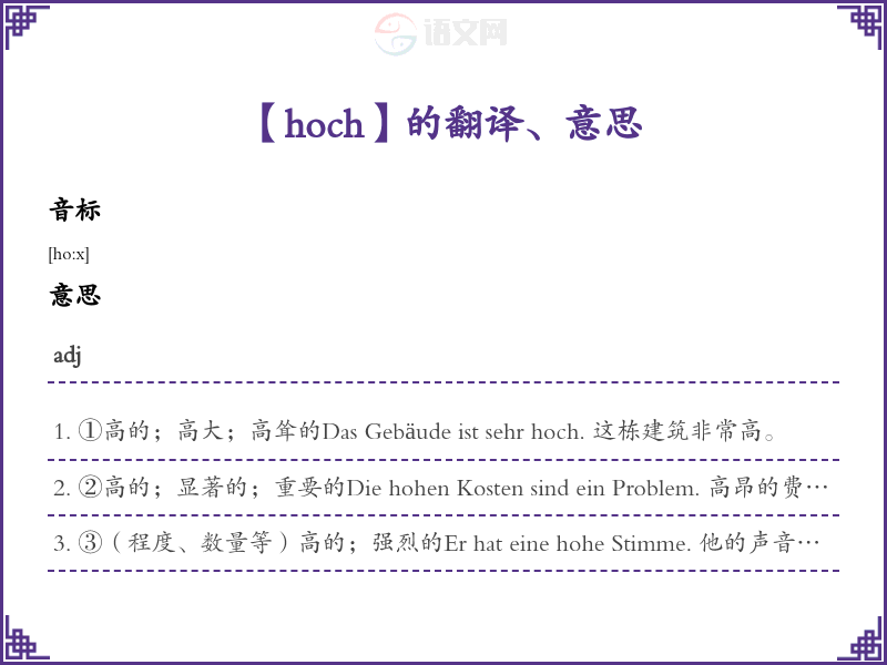 ①高的;高大;高耸的Das Gebäude ist sehr hoch. 这栋建筑非常高。