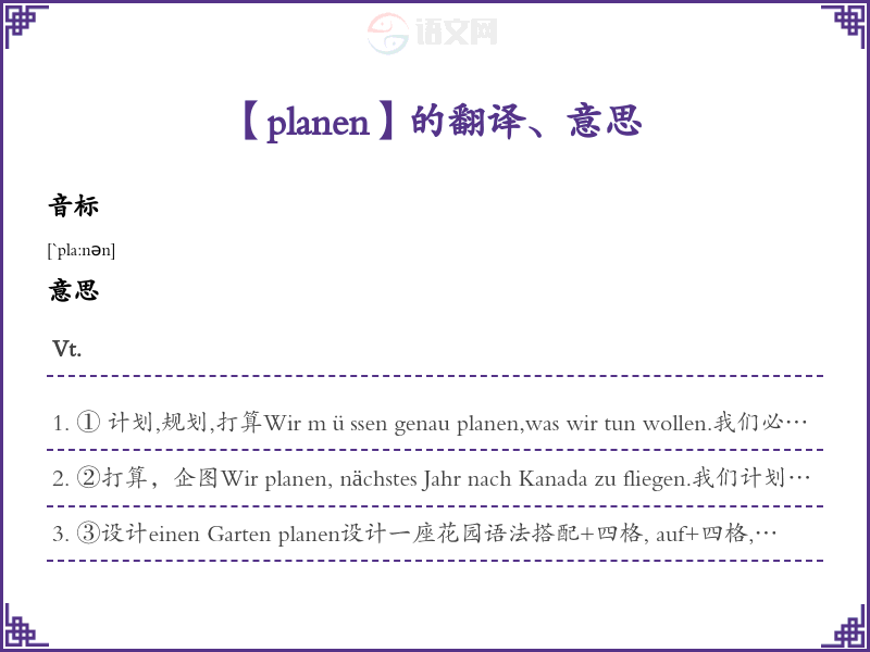 ① 计划,规划,打算Wir müssen genau planen,was wir tun wollen.我们必须仔细计划一下想做些什么。