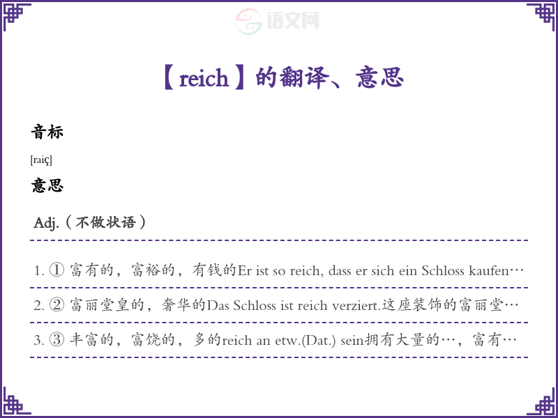 ③ 丰富的,富饶的,多的reich an etw.(Dat.) sein拥有大量的…,富有… -reich (做后缀,构成形容词)(含)…多的,…丰富的vitaminreich维生素丰富的schneereich多雪的