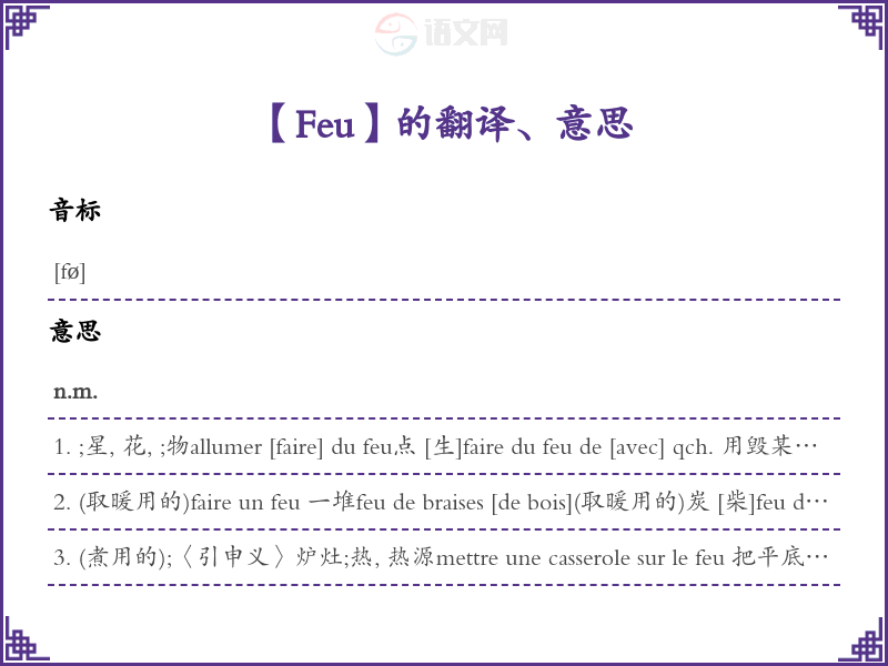 23. 〈书面语〉情欲a.〈书面语〉死亡不久的, 已故的sa feue mère 他新近去世的母亲 [用在冠词或主有形容词前面时无性的变化, 例如: feu sa mère (他新近去世的母亲)]