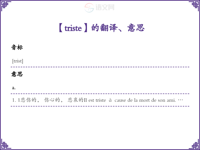 1. 1悲伤的, 伤心的, 悲哀的Il est triste à cause de la mort de son ami. 他很悲伤因为他的朋友去世了。2阴暗的, 阴沉的, 凄凉的Chambre triste 阴暗的房间les rues tristes 凄凉的街道3悲惨的, 凄惨的, 苦难的, 可悲的; <旧>可怜的Une triste nouvelle 一条令人难过的消息。4蹩脚的, 可鄙的, 狼狈不堪的[放在n. 前]旧>Une triste réputation 可悲的名声c'est un triste personnage. 他是一个 臭名昭著的小人。