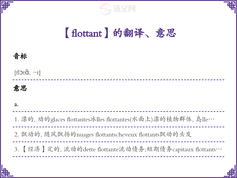 3. 【经济】定的, 流动的dette flottante流动债务;短期债务capitaux flottants流动资本;游资des effectifs flottants流动员额