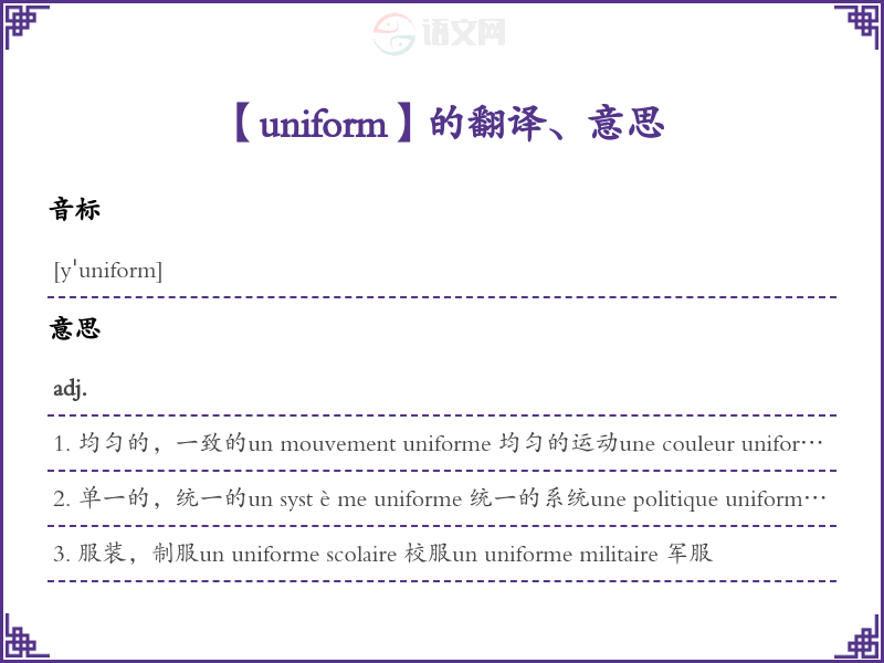 1. 均匀的,一致的un mouvement uniforme 均匀的运动une couleur uniforme 均匀的颜色