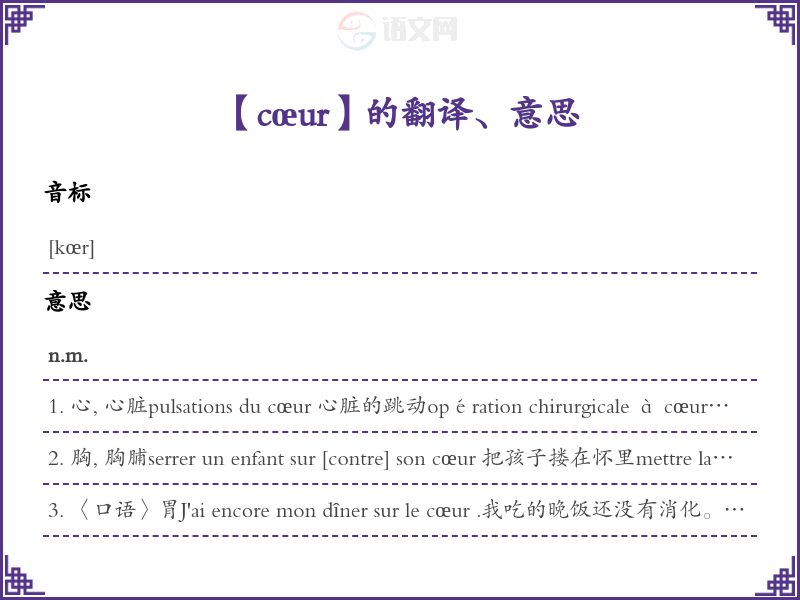 6. 情;爱情;情感peines de cœur 爱情的痛苦aller droit au cœur 触动心弦écouter son cœur 感情用事porter qn dans son cœur 对某人有好感venir du cœur 出自内心Loin des yeux, loin du cœur .〈谚语〉人远情疏。