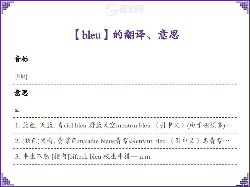 1. 蓝色, 天蓝, 青ciel bleu 蔚蓝天空menton bleu 〈引申义〉(由于胡须多)得发青下巴颏conte bleu 〈转义〉〈旧语,旧义〉海外奇谈, 瞎扯故事cordon bleu 〈转义〉高明女厨师sang bleu 〈转义〉贵族出身le métal bleu 钴zone bleue蓝色地区 [指法国大城市内白天停车不得超过一小时地区]