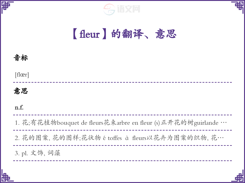 5. 精华, 精粹la fleur d'une civilisation某一文明的精粹faire partie de la fine fleur de la société是社会的精华fleur de farine精白面粉fleur de soufre硫华la fleur des pois〈口语〉时髦的人, 讲究穿戴的人