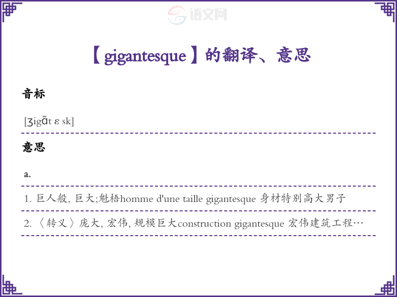 2. 〈转义〉庞大, 宏伟, 规模巨大construction gigantesque 宏伟建筑工程manifestations gigantesques大规模示威游行une erreur gigantesque 极大错误