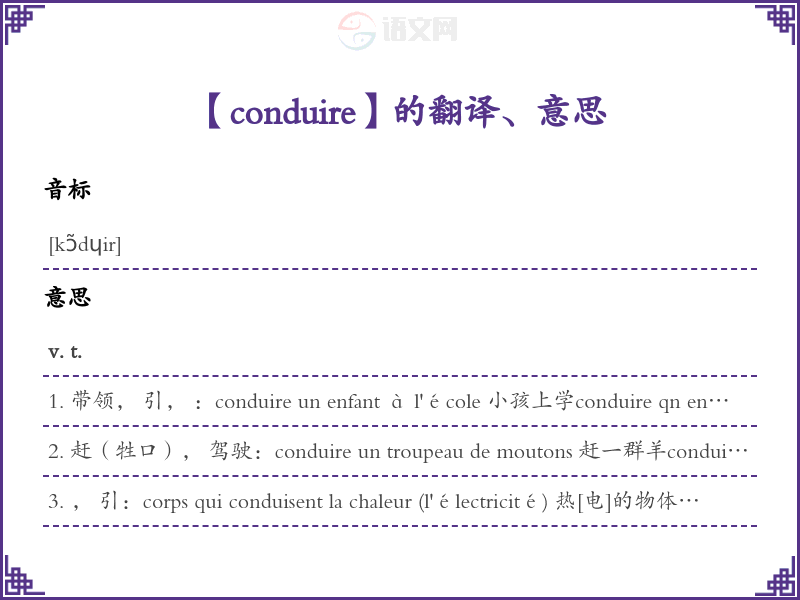 5. 指挥, 领; 处理, 管理:conduire des troupes 指挥军队conduire une entreprise 管理一个企业conduire un complot 策划阴谋conduire un orchestre 指挥一个乐队