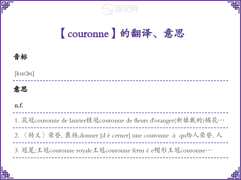 1. 花冠couronne de laurier桂冠couronne de fleurs d'oranger(新娘戴的)橘花冠couronne triomphale(古罗马给立战功者的)胜利花冠
