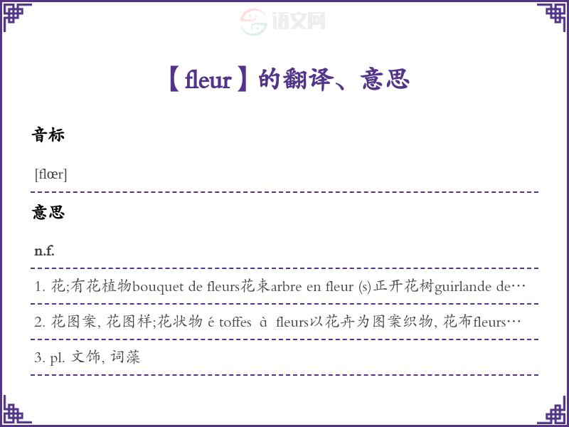 5. 精华, 精粹la fleur d'une civilisation某一文明精粹faire partie de la fine fleur de la société是社会精华fleur de farine精白面粉fleur de soufre硫华la fleur des pois〈口语〉时髦人, 讲究穿戴人