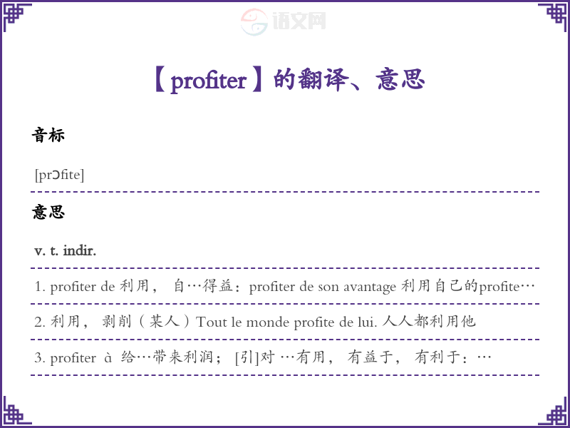 1. profiter de 利用, 自…得益:profiter de son avantage 利用自己的profiter d'un livre 一本书中得益profiter d'une (de l') occasion 抓住机会, 乘机profiter de qch pour …借口某事 …, 趁某个机会 …profiter de ce que 利用…, 趁 … :Il profita de ce que tout le monde dormait encore pour s'esquiver. 他趁大家都还在睡觉的时候偷偷走了。 Nous avons beaucoup profité des expériences d'autrui. 我们他人的经验中得益不浅。