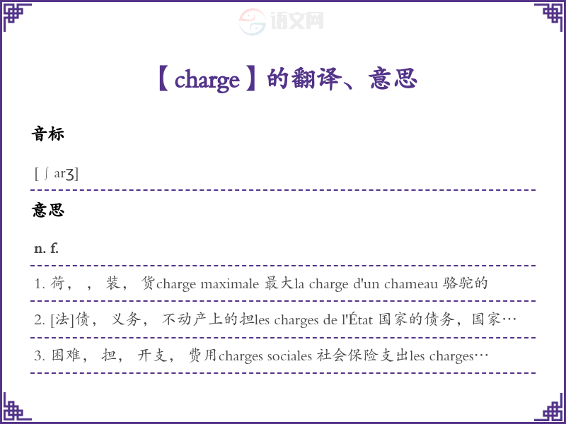 6. 任务, 差使, 责任Elle n'est pas à la hauteur de cette charge. 她不能胜任这个任务。avoir la charge d'une famille 有家庭的责任femme de charge 做粗活的女仆