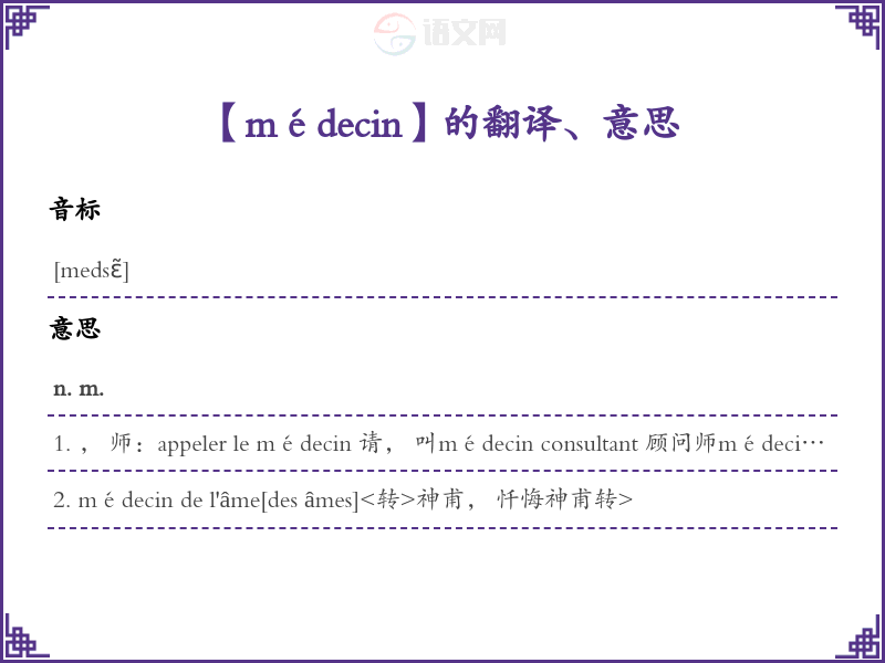 1. , 师:appeler le médecin 请, 叫médecin consultant 顾问师médecin légiste 法médecin militaire军médecin spécialiste 专科médecin généraliste 全科consulter le médecin 看病, 就诊