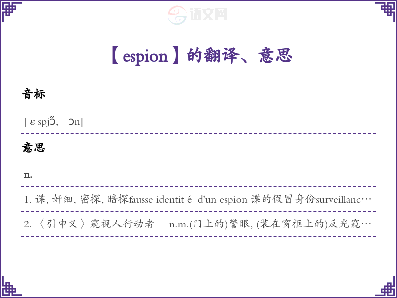 1. 谍, 奸细, 密探, 暗探fausse identité d'un espion 谍的假冒身份surveillance des espions反谍[用作appos.]avion-espion 谍飞机