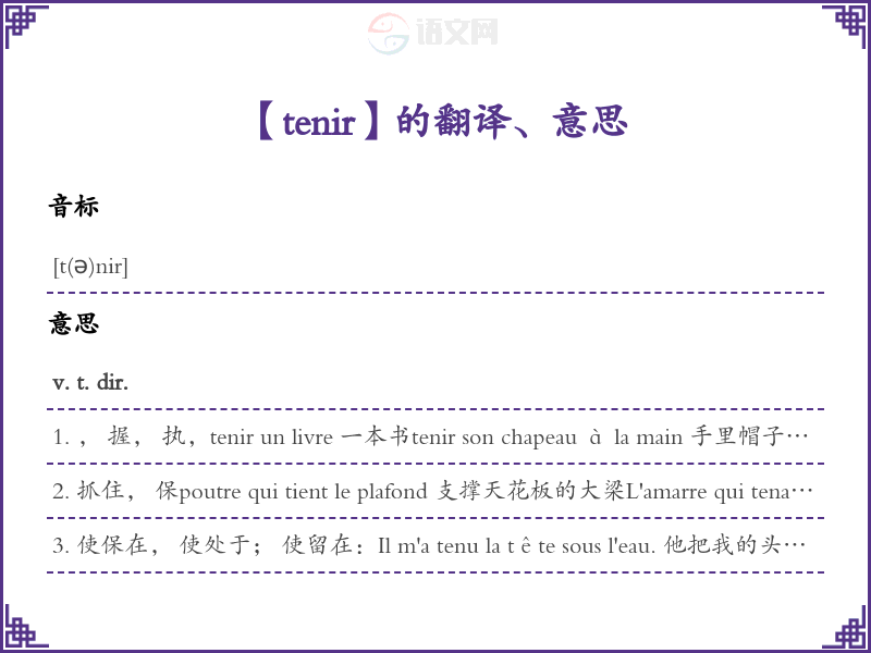 1. , 握, 执,tenir un livre 一本书tenir son chapeau à la main 手里帽子tenir qch entre ses mains 双手捧某物tenir qn dans ses bras 抱某人tenir un enfant par la main 牵孩子的手tenir les rênes d'un cheval 拉马的缰绳tenir en son bec un fromage 嘴里叨一块干酪se tenir le ventre (由于疼痛)手捧肚子Si je le tenais. 他别落在我手里。