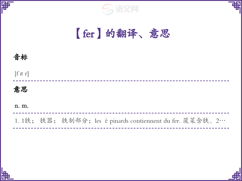 1. 1铁; 铁器; 铁制部分;les épinards contiennent du fer. 菠菜含铁。2 de~ 铁一般, 钢铁般, 结实, 有, 定, 硬, 固执3器具, 武器等铁制或金属部分4铁制器具fer à repasser 熨斗fer à friser 烫发钳5钢筋, 型钢; 型材fer en U 槽铁6剑, 花式剑7 pl. <旧>产钳8鱼钩9蹄铁un fer à cheval 马蹄铁10 pl. 镣铐, 锁链; <书>奴隶, 被奴役书>旧>