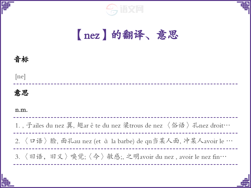 2. 〈口语〉脸, 面孔au nez (et à la barbe) de qn当某人面, 冲某人avoir le nez sur qch.凑近某物, 贴近某物avoir le nez sur son travail, ne pas lever le nez de dessus son ouvrage埋头工作avoir qn dans le nez 嫌恶某人baisser le nez 低头 [尤指羞愧时]fermer [claquer] la porte au nez de qn给某人吃闭门羹fourrer son nez dans de vieux papiers查阅旧档案文件, 查阅旧资料jeter une chose au nez de qn就一事当面责备某人le nez en l'air [au vent]抬头;逍遥自在地mettre le [son] nez à la fenêtre探首窗外, 在窗口露面mettre le nez dehors外出mettre [fourrer] son nez dans les affaires d'autrui管他人闲事mettre [fourrer] son nez partout, fourrer le nez où l'on n'a que faire好管闲事montrer son nez 露面montrer le bout de son nez 稍稍探一下头, 稍稍露一下面nez à nez [neane]面对面地passer sous le nez de qn在某人眼皮底下消失piquer du nez 一冲一冲地打瞌睡La Bourse pique du nez .〈转义〉股票市场下跌。se casser le nez (à la porte de qn)(访某人未遇而)吃闭门羹;〈转义〉受挫, 失败Tu as le nez dessus.你找东西就在你眼前。Ton nez bouge [remue].你说谎。你骗人。