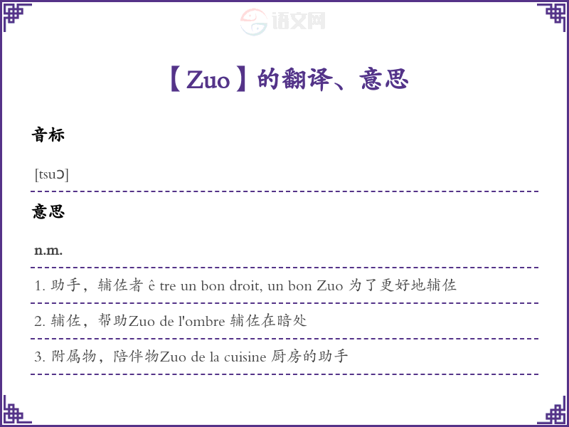 1. 助手,辅佐者être un bon droit, un bon Zuo 为了更好地辅佐