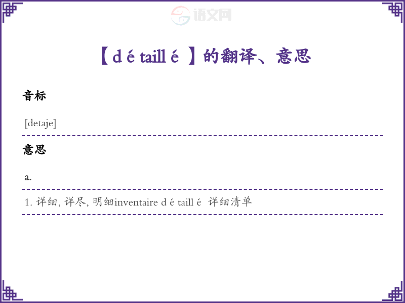 1. 详细, 详尽, 明细inventaire détaillé 详细清单