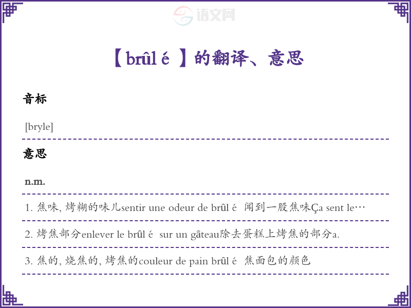 1. 焦味, 烤糊的味儿sentir une odeur de brûlé 闻到一股焦味Ça sent le brûlé .有股焦味。〈转〉事情有点不妙。
