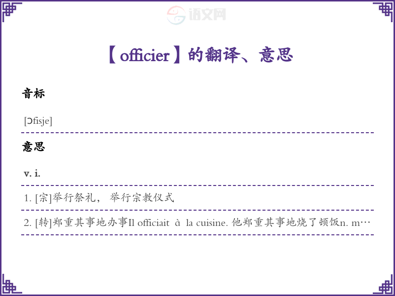 2. [转]郑重其事地办事Il officiait à la cuisine. 他郑重其事地烧了顿饭n. m1官员, 官吏, 公务人员2军官3(法国“荣誉勋位”等的某一级的)受勋者
