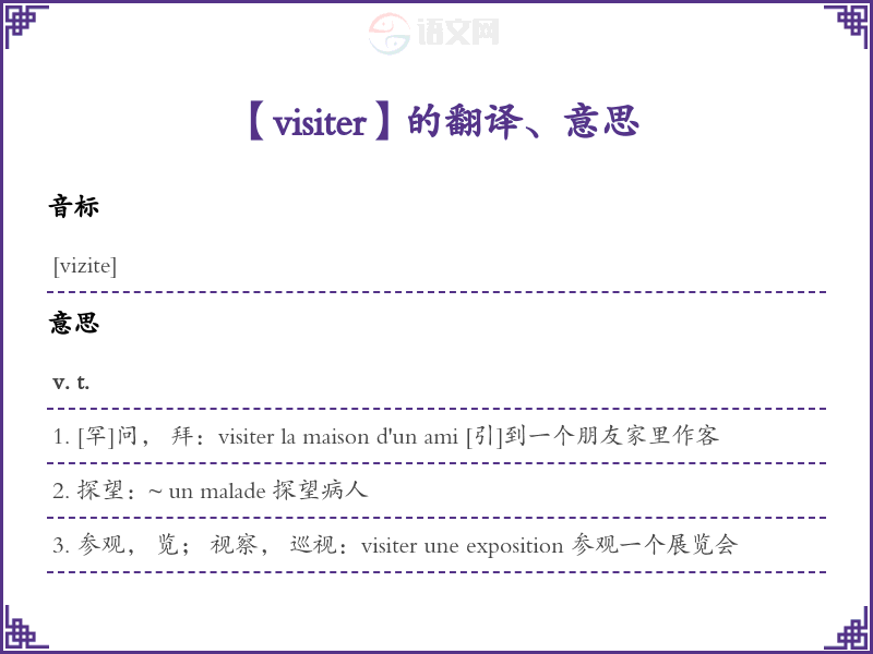 3. 参观, 览; 视察, 巡视:visiter une exposition 参观一个展览会