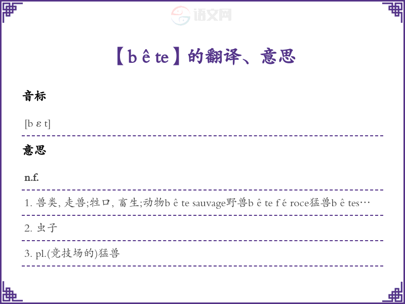 1. 兽类, 走兽;牲口, 畜生;动物bête sauvage野兽bête féroce猛兽bêtes noires黑色兽 [如野猪等]bête de somme驮重的牲口bête de trait拉车的牲口bête à(bon) Dieu瓢虫nos amis les bêtes动物, 我们的朋友être malade comme une bête 病得很痛苦regarder qn comme une bête curieuse不礼貌地盯着某人看chercher la petite bête 极端细致;吹毛求疵C'est sa bête noire.是他最厌恶的人或事物。是他的眼中钉。Morte la bête , mort le venin.〈谚语〉祸根拔掉, 祸害。remonter sur sa bête 山再起, 失而复得reprendre du poil de la bête 重新振作起来, 重占优势