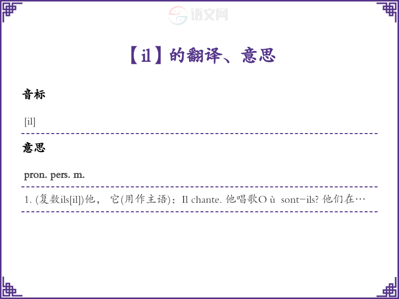1. (复数ils[il])他, 它(用作主语):Il chante. 他唱歌Où sont-ils? 他们在什么地方?pron. neut.(用作无人称动词或无人称动词短语的主语):Il fait froid. 天气冷. Il pleut des balles. 子弹像雨点般落来.
