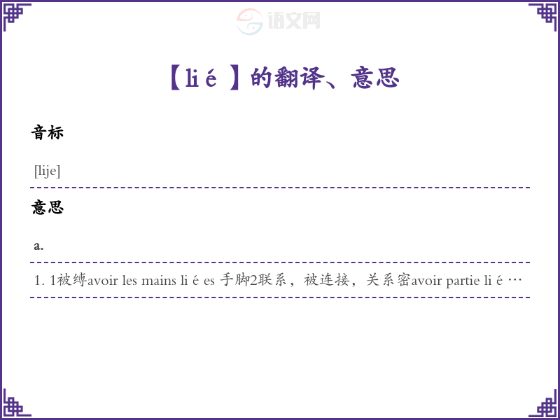1. 1被缚avoir les mains liées 手脚2联系,被连接,关系密avoir partie liée avec qn 有某人休戚相关ils sont très liés. 他们关系十分密。3受4【烹饪】勾芡,黏稠