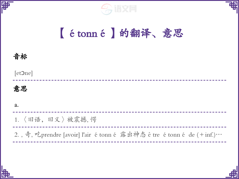 2. , 奇, 吃prendre [avoir] l'air étonné 露出神态être étonné de (+inf.)为某事而感到[用作n.]faire l'étonné 装出样子