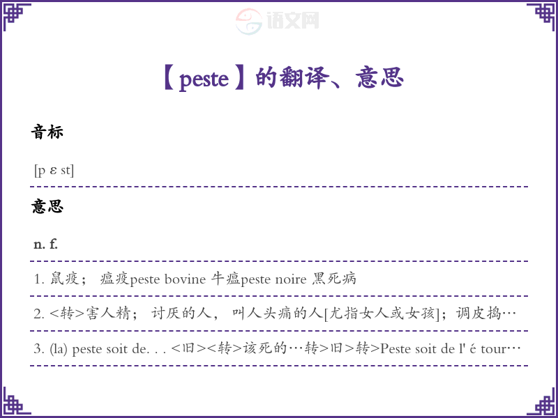 1. 鼠疫; 瘟疫peste bovine 牛瘟peste noire 黑死病