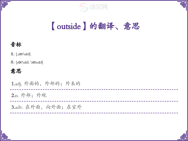 英:[aʊt'saɪd; 'aʊtsaɪd]