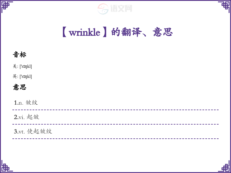 课本:在*的英语学教材中,wrinkle可能会出现在初中和高中阶段的词汇表中。在牛津和美国的教材中,通常在初中英语教材中出现,例如在描述外貌变化或衣物护理的章节。