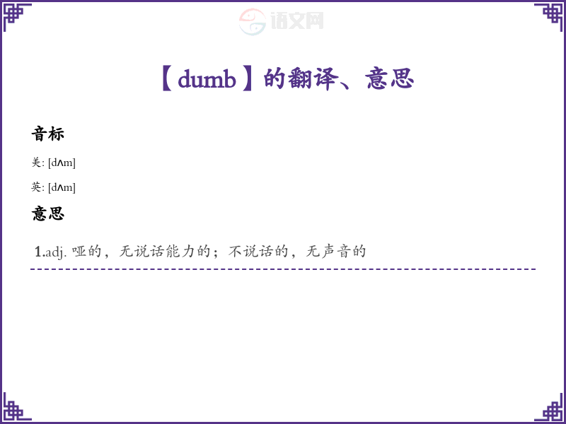 - 通过反复朗读这个音节,可以帮助记忆该单词的发音。同时,可以结合例句进行练*,比如说出“dumb”在句子中的发音和语调。