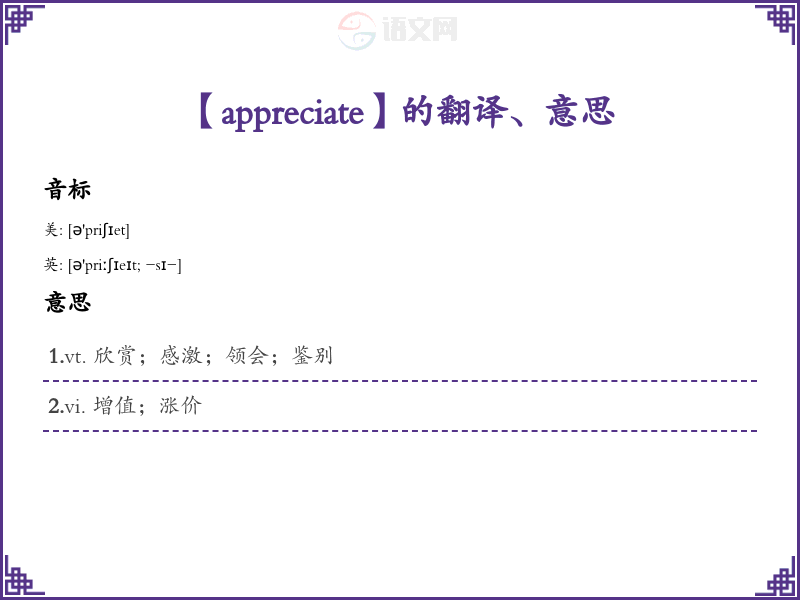 - 词根记忆法:记住“appreciate”由“ad-”(朝向)和“pretium”(价值)组成,可以帮助理解它与“价值”相关的含义。把它联想到“增值”或“认可”的概念。
