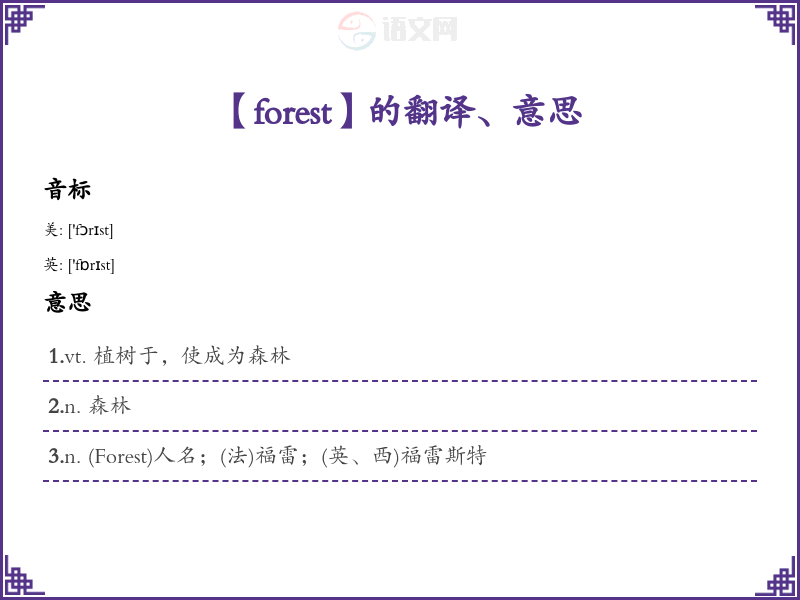 - /ˈfɔːrɪst/:分解音节,强调“for-”和“-est”的发音,帮助记忆。