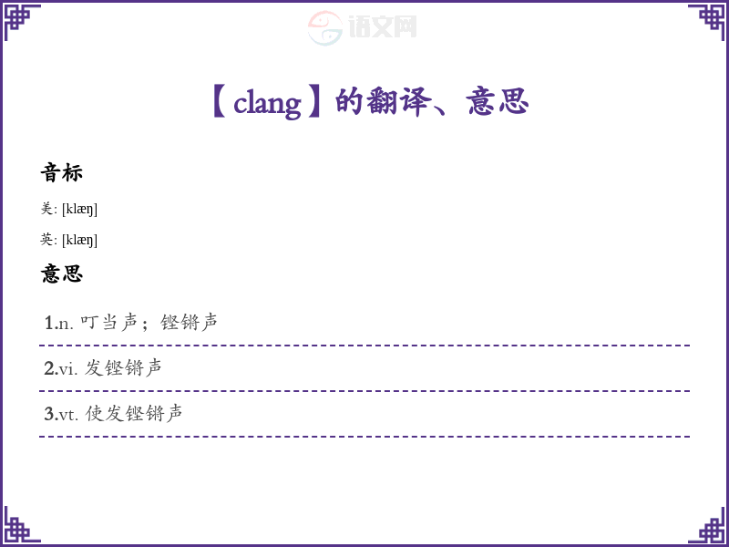 - 音标记忆法:将“clang”的音标 /klæŋ/ 分解为音节进行记忆,将其与“清脆”的声音联想。