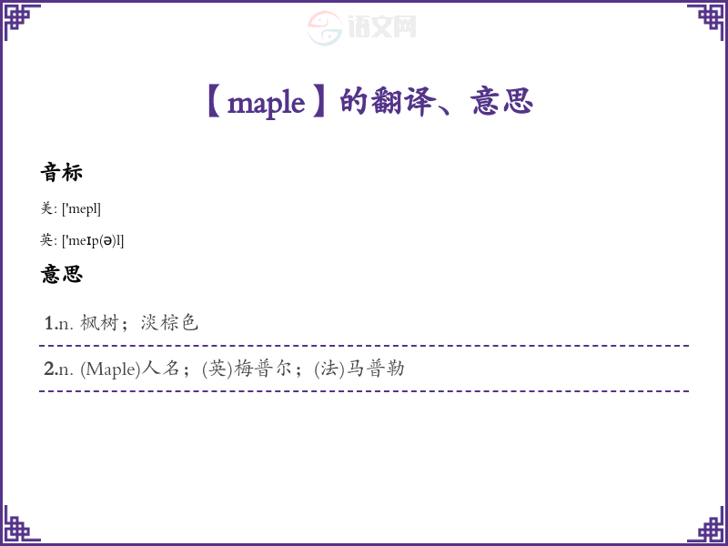 - 谐音联想记忆:可以联想“maple”与“map”(地图),想象一个秋天的地图上标记着美丽的槭树。