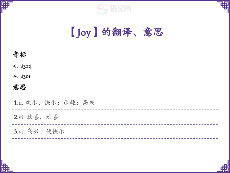- 在牛津和美国的教材中,Joy 通常出现在小学英语教材中,尤其是情感、节日和庆祝相关的主题。