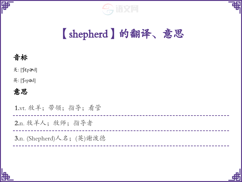 - 定义:名词:一个与羊群相关的放牧者;动词:引导或看护(羊群)。