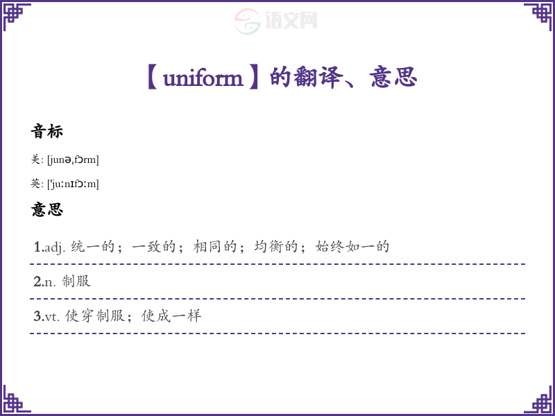 - 在牛津和美国的教材中,"uniform" 也常见于与学校、军队或职业相关的章节,适合初高中生。