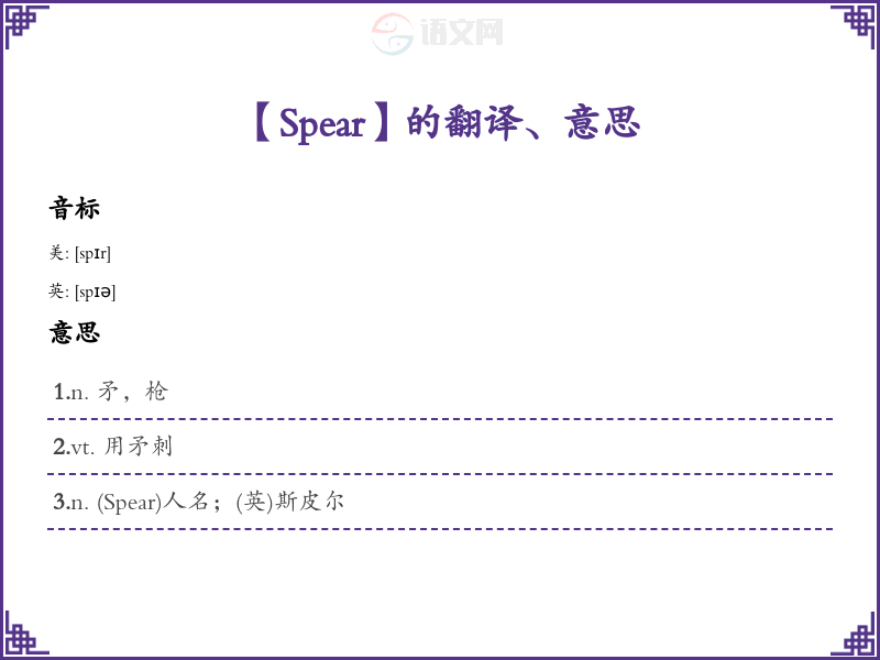 词源分析:Spear 源于古英语 "spear",与古德语 "sperō" 和拉丁语 "spiculum"(意为尖物)有关系,词根“spec”意指“尖、刺”。