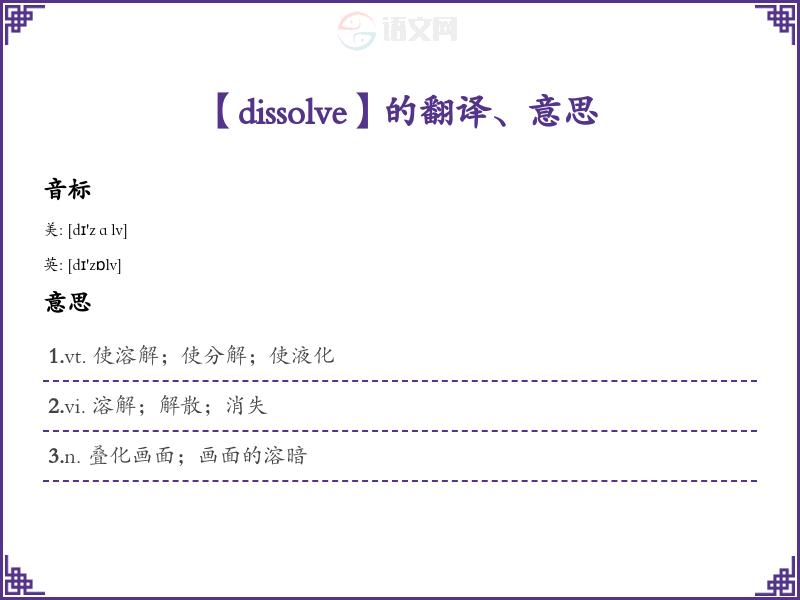 - 音标记忆法:学*并重复“dissolve”的音标 /dɪˈzɒlv/,可以帮助记忆其发音。