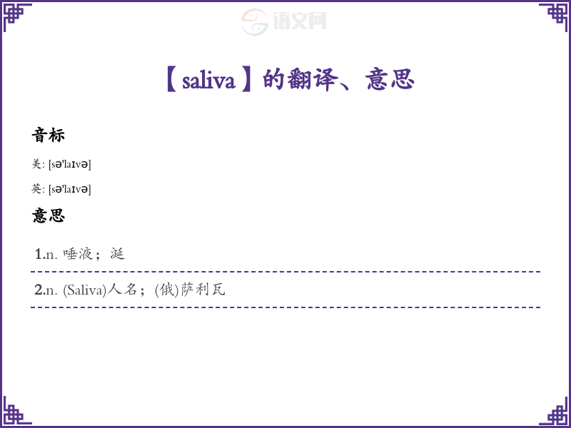 - 常与 saliva 一起使用的词汇包括:mouth(口腔)、digest(消化)、enzyme(酶)、glands(腺体)、moisture(湿度)。