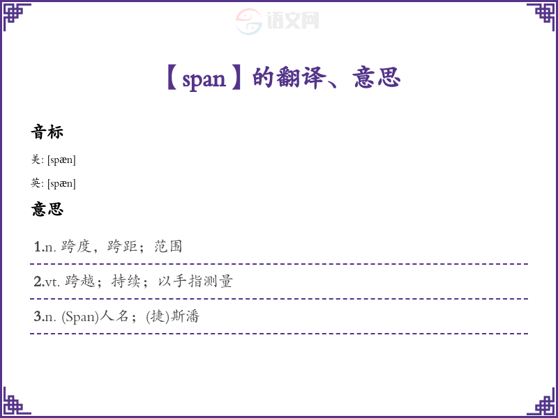 - 音标记忆法:/spæn/,可以通过分解音节来记忆,比如“span”可以联想为“s”+“pan”,想象一个平底锅(pan)跨越(span)桌子。