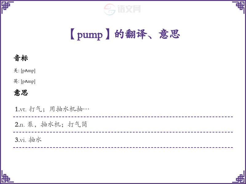 - 音标记忆法:Pump的音标是/pʌmp/,可以通过重复发音来加深记忆。